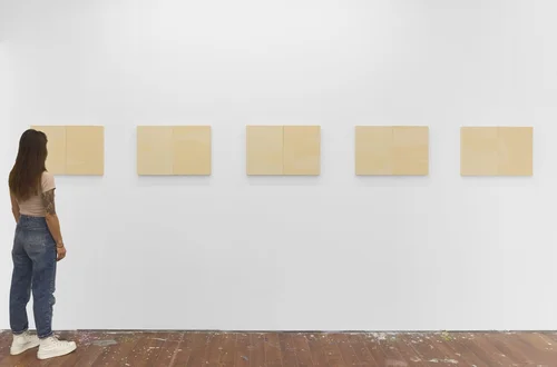 Formations is a series of diptychs that explore embodiment, healing, and the quiet complexity of connection. For this series, I painted five panels in a light beige tone and five in a slightly darker one. Using the inverse colour, I painted half of my body at a time and pressed it onto the panels, creating abstracted prints. Then did the same process on the opposite side, with the inverse colour. The paintings of the opposing sides of the body, when rearranged and paired, create subtle alignments. Not in a mirrored orientation, but in an unpredictable formation, where a breast and thigh come together in a balanced composition.