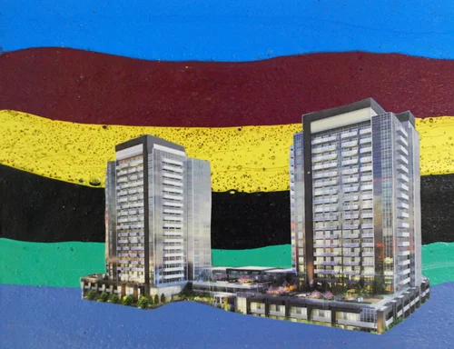 This body of work, with its vibrant colours and pop aesthetic, symbolically masks the exploitative nature of condominium developments in the city, critiquing their marketing strategies that often capitalize on artistic identity while simultaneously displacing the very art communities they claim to support.