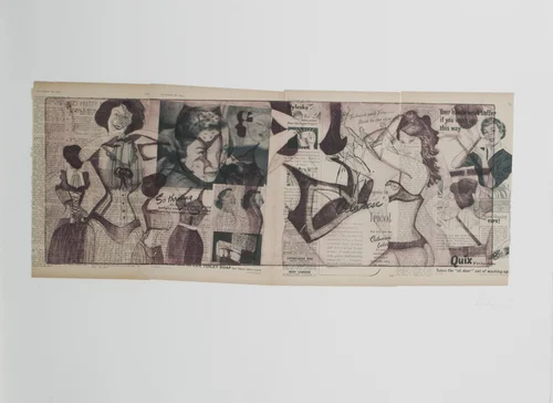 The process of making this work involved sourcing the vintage magazines, scanning the images to preserve the originals, before cutting and collaging them. The finished collages were then scanned and digitally split into four colour channels -CMYK- cyan, magenta, yellow and black — to create detailed, photorealistic images. The 4 colour channels were then printed on films and exposed to four photosensitive silk screens before being manually printed.