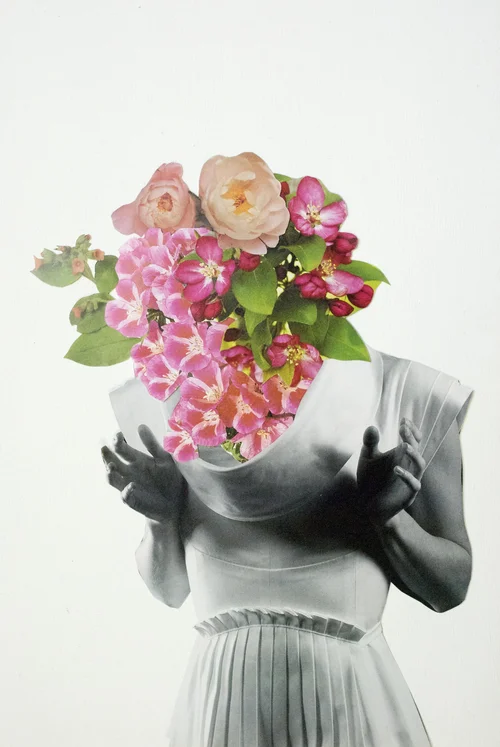 This collage series reflects on women in art and how their prominence is under appreciated. Women were typically encouraged to paint as a hobby and were frequently confined to their domestic dwellings. This often resulted in studies of interiors, still lives and commonly flowers. Flowers have come to have mixed symbolism in painting because while a plant typically would symbolize life, flowers that are cut will inevitably die. This series represents these woman as their kept flowers, full of life yet resigned to death.