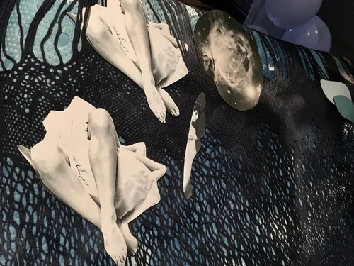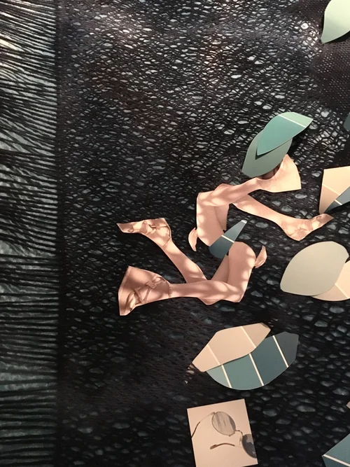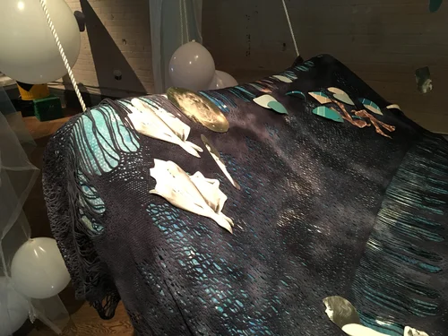 Textiles sourced from numerous locations are draped over the mattress as well as hung in a floating canopy above. Paper cut outs and paint colour samples are woven in and suspended around with fishing line.