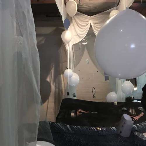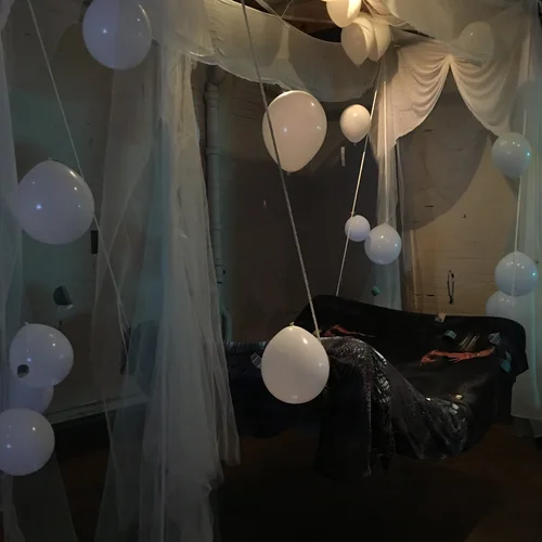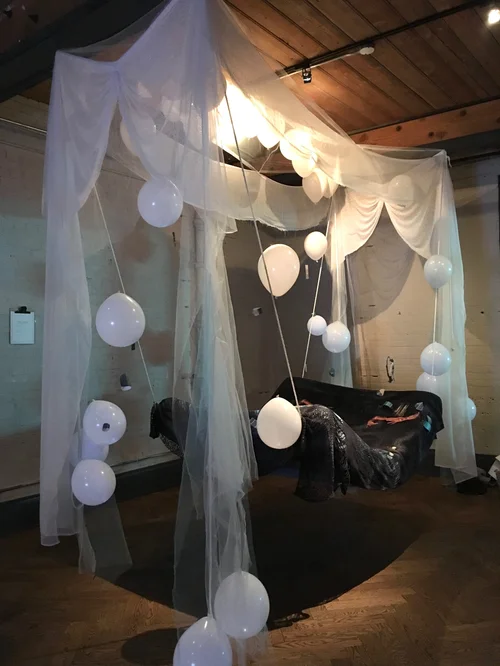 Helium balloons float and lift the fabric whimsically while the mattress is supported from the rafters with rope.