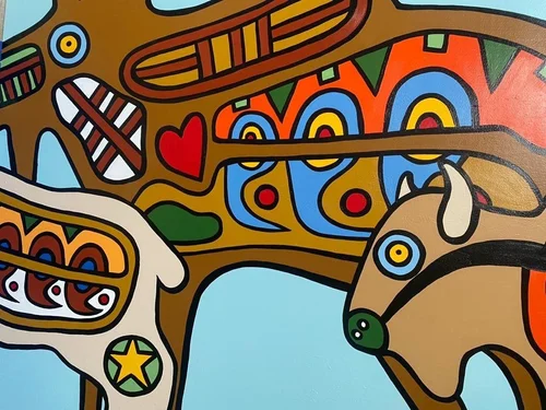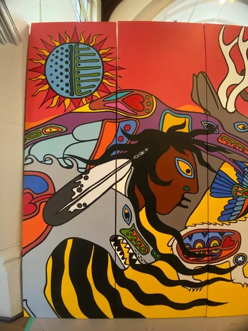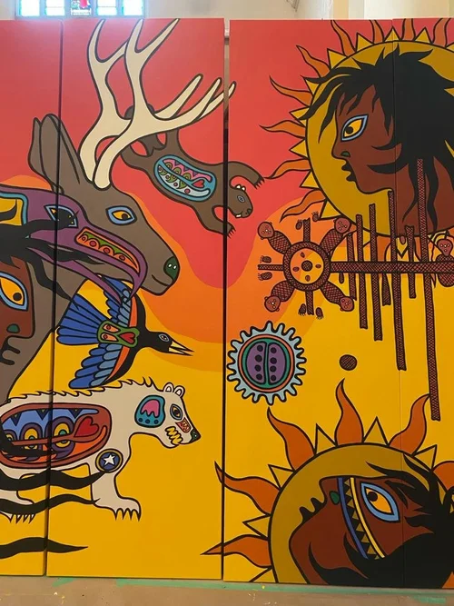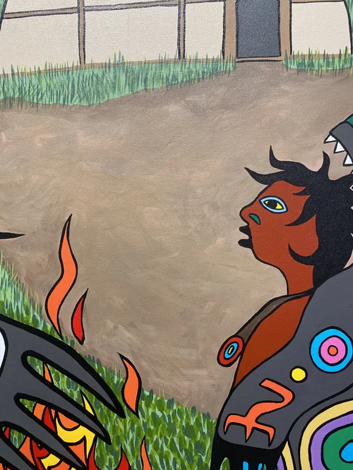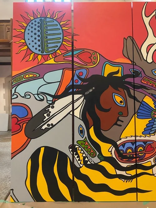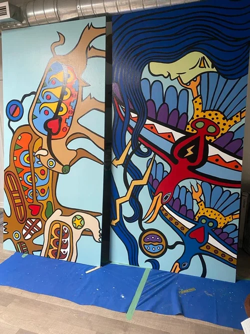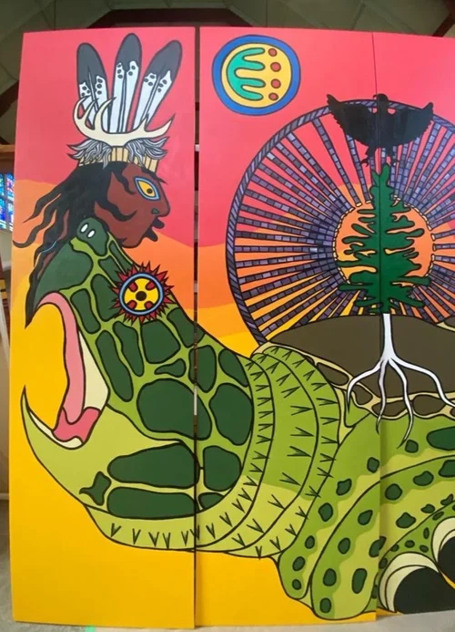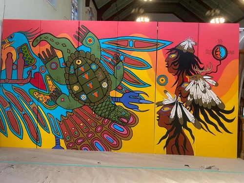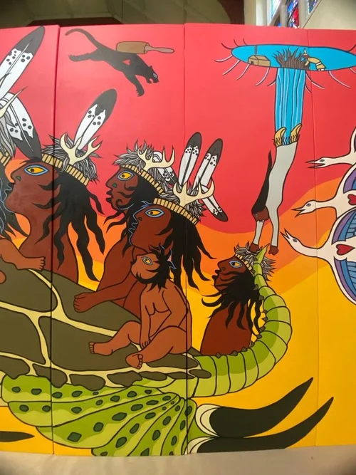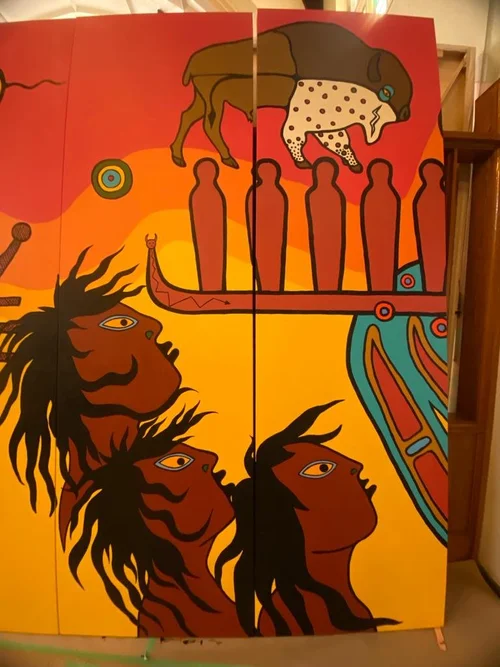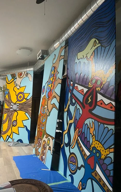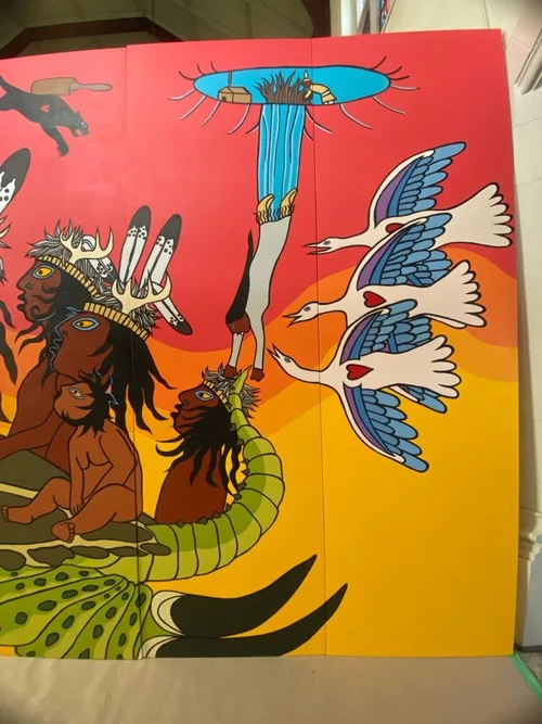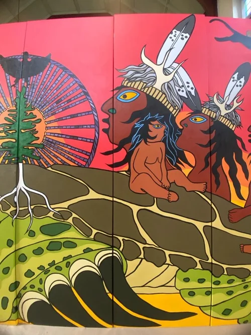 It is a depiction of one of our oldest stories, The Ojibway/Anishinaabe Creation Story which was brought down through oral traditions and pictographic images painted on birch-bark scrolls. This mural is in my own Contemporary Style of Woodland Painting and begins with The First Man and The First Woman and their sacred union and the beginning of The Creation Story.