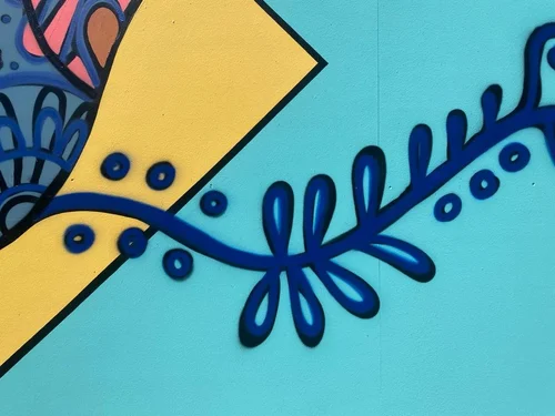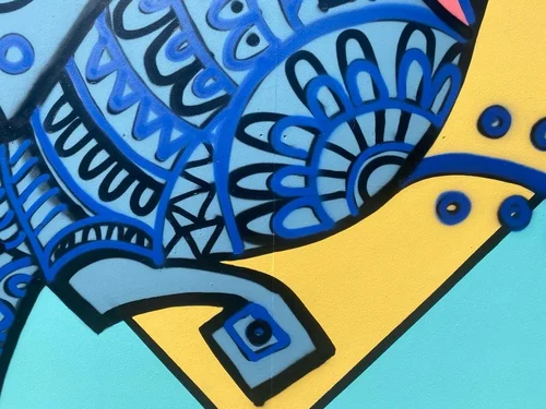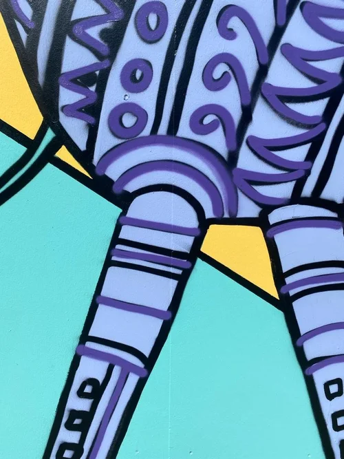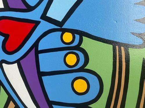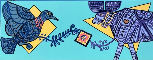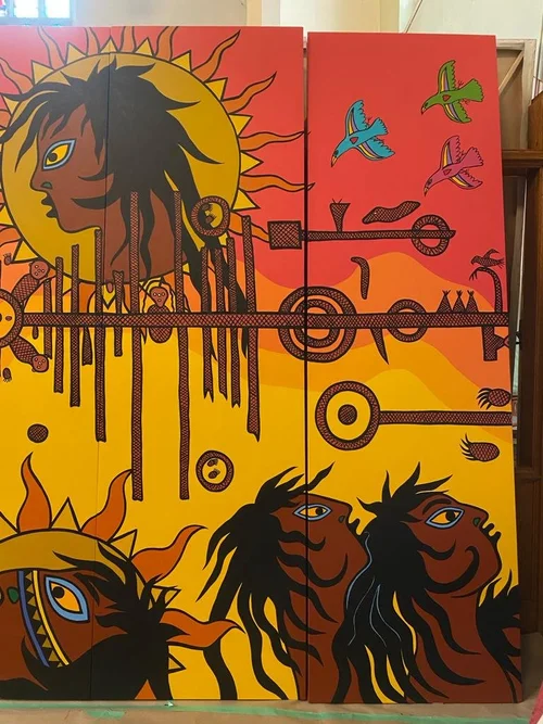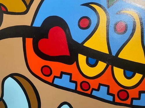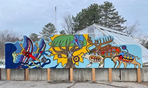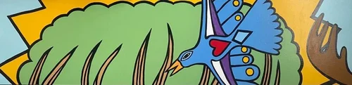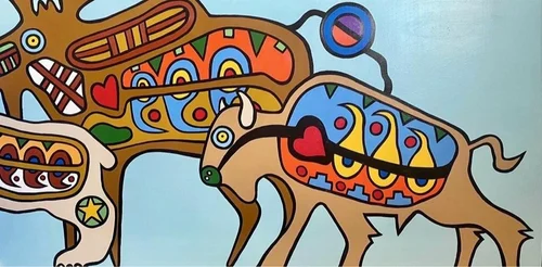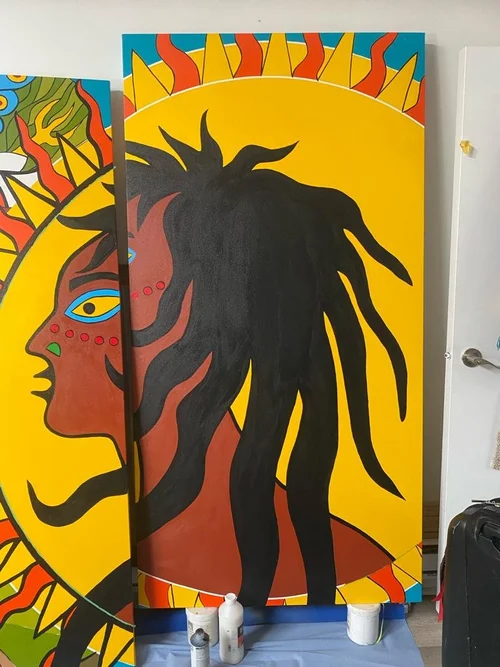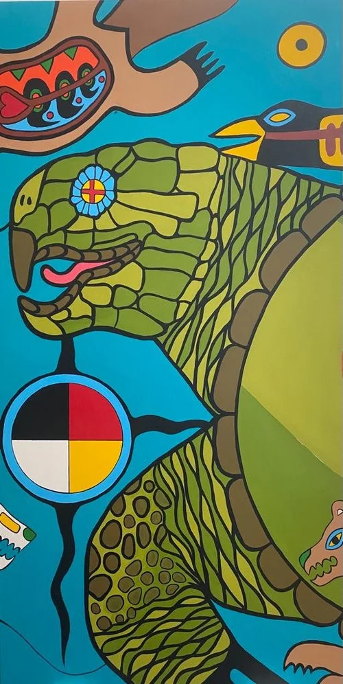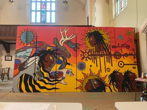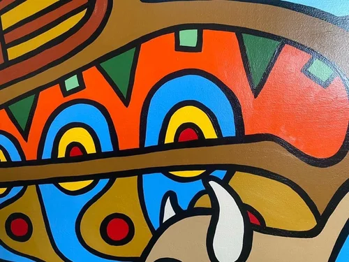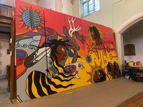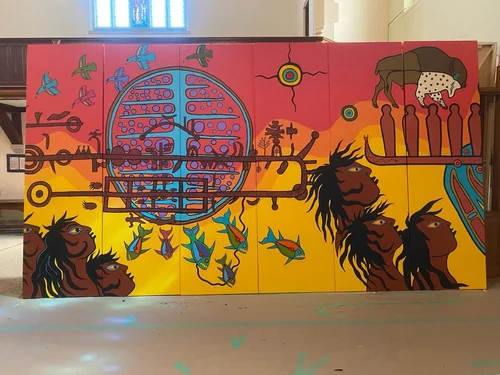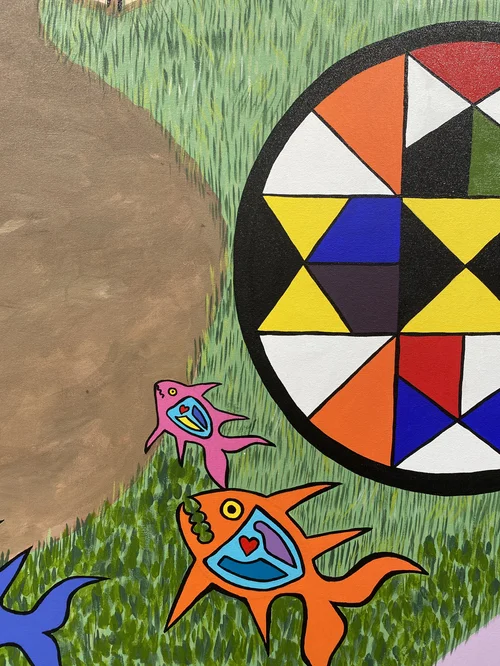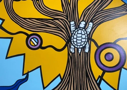 It is a depiction of one of our oldest stories, The Ojibway/Anishinaabe Creation Story which was brought down through oral traditions and pictographic images painted on birch-bark scrolls. This mural is in my own Contemporary Style of Woodland Painting and begins with The First Man and The First Woman and their sacred union and the beginning of The Creation Story.