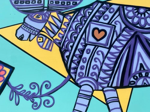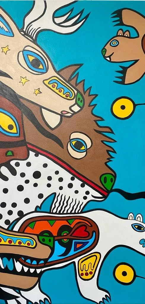The woodland designs are deeply connected to the creation story of the Anishinaabe as this design with all its black lines speaks about the beginning of the Universe. There are designs within the animals that represent the two worlds – the physical and spiritual – and the heart can be seen running through the middle of these two worlds representing “Heart Thinking” – our way of navigating between these worlds is the best way to live in order to leave a legacy for future generations.
